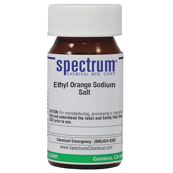 Ethyl Orange Sodium Salt, Concentration 100 Percent, CAS Number 62758-12-7, Molecular Weight F.W. 355.39, Chemical Formula C16H18N3NaO3S, Chemical Container Material Amber Glass, Chemical Container Type Bottle, Chemical Grade Reagent, Chemical Container Size 5 g, Chemical Family Type Standards and Solutions, Shelf Life 24 mo