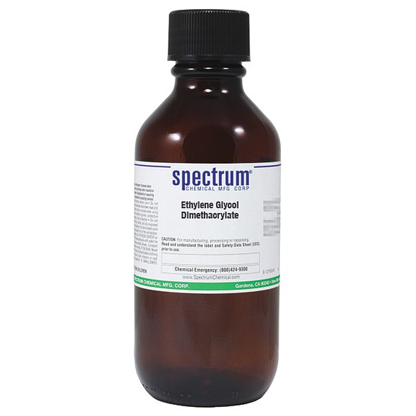 Ethylene Glycol Dimethacrylate, Concentration 100 Percent, CAS Number 97-90-5, Molecular Weight 198.22, Chemical Formula C10H14O4, Chemical Container Material Amber Glass, Chemical Container Type Bottle, Chemical Grade Reagent, Chemical Container Size 500 mL, Chemical Family Type Bases, Shelf Life 24 mo