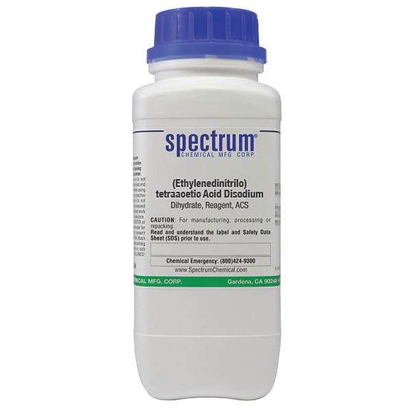 (Ethylenedinitrilo)tetraacetic Acid Disodium, Dihydrate, Reagent, ACS, CAS Number 6381-92-6, Molecular Weight 372.24, Chemical Formula C10H14N2Na2O8 x 2H2O, Chemical Container Material Plastic, Chemical Container Type Bottle, Chemical Grade ACS, Chemical Container Size 500 g, Chemical Family Type Analytical Reagents, Shelf Life 24 mo, Shipping Restrictions Chemical Not Regulated For Transport