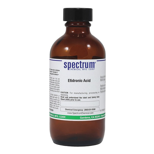 Etidronic Acid, Concentration 100 Percent, CAS Number 2809-21-4, Molecular Weight 206, Chemical Formula C2H8O7P2, Chemical Container Material Amber Glass, Chemical Container Type Bottle, Chemical Grade Reagent, Chemical Container Size 100 g, Chemical Family Type Acids, Shelf Life 24 mo