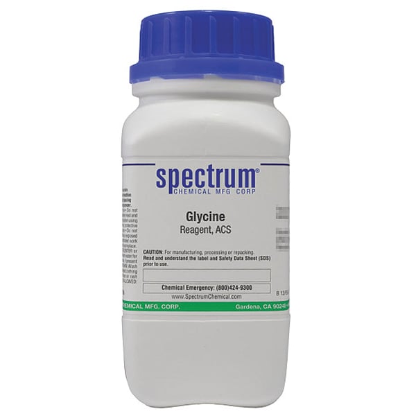 Glycine, Concentration Not Applicable, CAS Number 56-40-6, Molecular Weight 75.07, Chemical Formula C2H5NO2, Chemical Container Material Plastic, Chemical Container Type Bottle, Chemical Grade ACS, Chemical Container Size 500 g, Chemical Family Type Reagent, Shelf Life 24 mo, Shipping Restrictions Chemical Not Regulated For Transport, Standards Not Applicable, Special Information Not Applicable