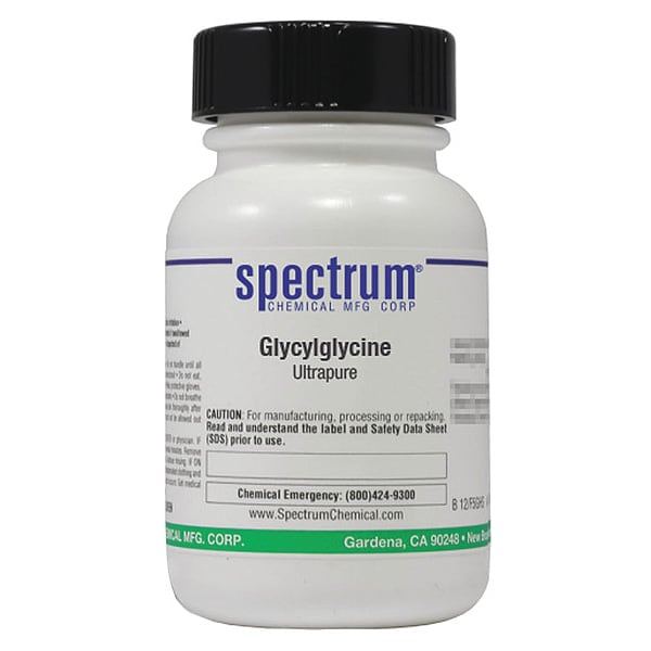 Glycylglycine, Ultrapure, CAS Number 556-50-3, Molecular Weight 132.12, Chemical Formula C4H8N2O3, Chemical Container Material Plastic, Chemical Container Type Bottle, Chemical Grade Purified, Chemical Container Size 25 g, Shelf Life 24 mo, Shipping Restrictions Chemical Not Regulated For Transport, Special Information The Simplest Peptide
