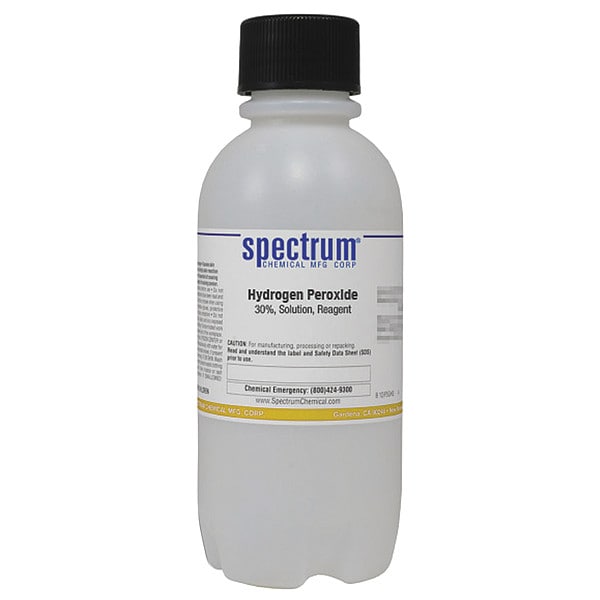 Hydrogen Peroxide, Concentration 30 Percent, CAS Number 7722-84-1, 7732-18-5, Molecular Weight 34.01, Chemical Formula H2O2, Chemical Container Material Plastic, Chemical Container Type Bottle, Chemical Grade Lab, Chemical Container Size 500 mL, Chemical Family Type Reagent, Shelf Life 24 mo, Shipping Restrictions UN2014, Hydrogen Peroxide, Aqueous Solution, 5.1, PG II, Standards Not Applicable, Special Information Not Applicable
