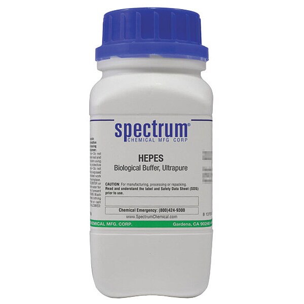 HEPES, Biological Buffer, Ultrapure, CAS Number 7365-45-9, Molecular Weight 238.3, Chemical Formula C8H18O4N2S, Chemical Container Material Plastic, Chemical Container Type Bottle, Chemical Grade Purified, Chemical Container Size 250 g, Shelf Life 18 mo, Shipping Restrictions Chemical Not Regulated For Transport