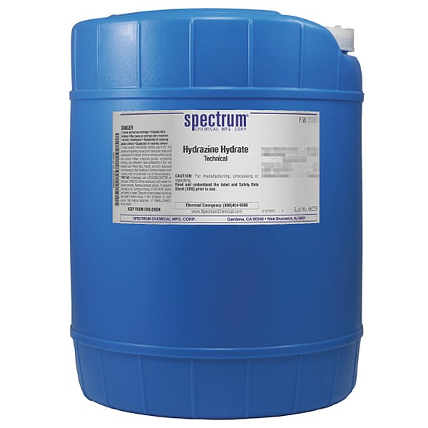 Hydrazine Hydrate, Technical, CAS Number 7803-57-8, Molecular Weight F.W. 50.06, Chemical Formula H4N2�H2O, Chemical Container Material Plastic, Chemical Container Type Drum, Chemical Grade Technical, Chemical Container Size 5 gal, Shelf Life 24 mo, Shipping Restrictions UN2030, Hydrazine aqueous solution, 8 (6.1), PG II