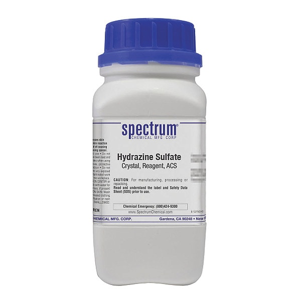 Hydrazine Sulfate, Crystal, Reagent, ACS, CAS Number 10034-93-2, Molecular Weight F.W. 130.12, Chemical Formula H4N2�H2SO4, Chemical Container Material Plastic, Chemical Container Type Bottle, Chemical Grade ACS, Chemical Container Size 500 g, Shelf Life 24 mo, Shipping Restrictions UN1759, Corrosive solid, n.o.s. (hydrazine sulfate), 8, PG II