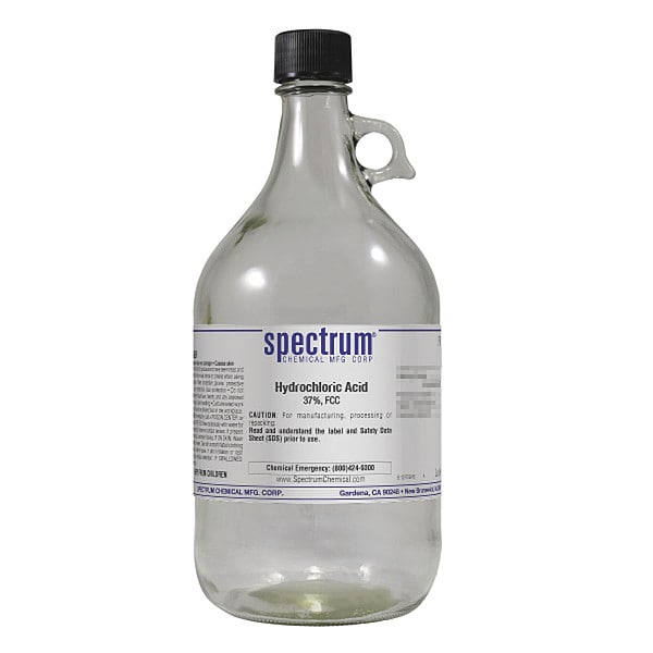 Hydrochloric Acid, Concentration 37 Percent, CAS Number 7647-01-0, Molecular Weight 36.46, Chemical Formula HCl, Chemical Container Material Clear Glass, Chemical Container Type Bottle, Chemical Grade FCC, Chemical Container Size 2.5 L, Chemical Family Type Acid, Shelf Life 24 mo, Shipping Restrictions UN1789, Hydrochloric Acid, Solution, 8, PG II, Standards Not Applicable, Special Information Not Applicable