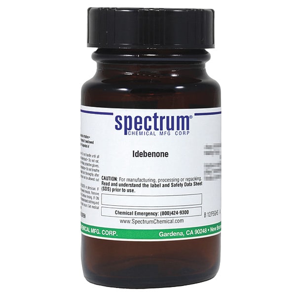 Idebenone, CAS Number 58186-27-9, Molecular Weight F.W. 338.44, Chemical Formula C19H30O5, Chemical Container Material Amber Glass, Chemical Container Type Bottle, Chemical Grade Lab, Chemical Container Size 25 g, Chemical Family Type Analytical Reagents, Shelf Life 24 mo