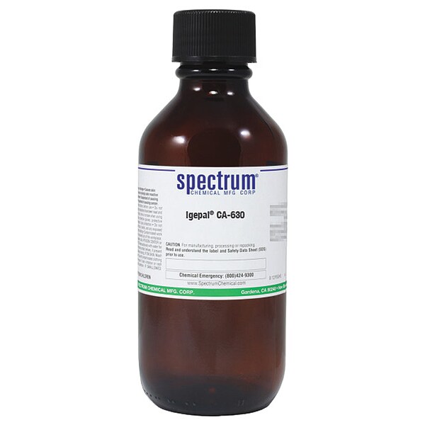 Igepal(R) CA-630, Concentration Not Applicable, CAS Number 9002-93-1, Molecular Weight 602.80-646.85, Chemical Formula (C2H4O)nC14H22O, n=9-10, Chemical Container Material Amber Glass, Chemical Container Type Bottle, Chemical Grade Lab, Chemical Container Size 500 mL, Chemical Family Type Reagent, Shelf Life 24 mo, Shipping Restrictions Chemical Not Regulated For Transport, Standards Not Applicable, Special Information Not Applicable