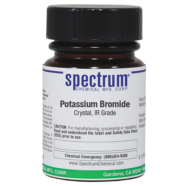 Potassium Bromide, Crystal, IR Grade, CAS Number 7758-02-3, Molecular Weight 119, Chemical Formula KBr, Chemical Container Material Amber Glass, Chemical Container Type Bottle, Chemical Grade HPLC, Chemical Container Size 25 g, Chemical Family Type Analytical Reagents, Shelf Life 24 mo, Shipping Restrictions Chemical Not Regulated For Transport, Special Information Suitable For Infrared Analysis