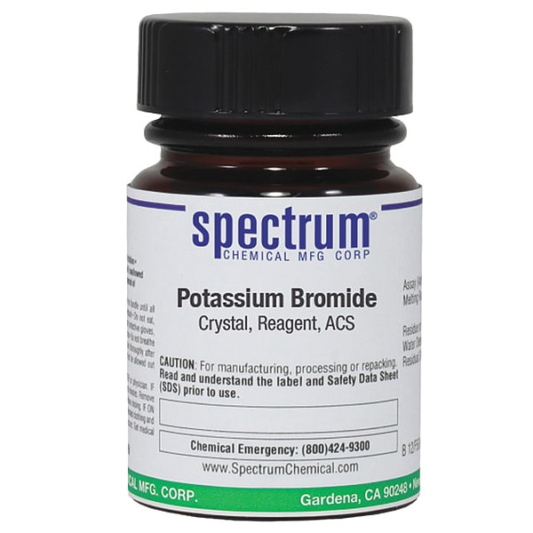 Potassium Bromide, Crystal, Reagents, ACS, CAS Number 7758-02-3, Molecular Weight 119, Chemical Formula KBr, Chemical Container Material Amber Glass, Chemical Container Type Bottle, Chemical Grade ACS, Chemical Container Size 25 g, Chemical Family Type Analytical Reagents, Shelf Life 24 mo, Shipping Restrictions Chemical Not Regulated For Transport