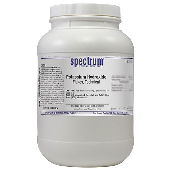 Potassium Hydroxide, Concentration Not Applicable, CAS Number 1310-58-3, Molecular Weight 56.11, Chemical Formula KOH, Chemical Container Material Plastic, Chemical Container Type Bottle, Chemical Grade Lab, Chemical Container Size 2.5 kg, Chemical Family Type Inorganic, Shelf Life 24 mo, Shipping Restrictions UN1813, Potassium Hydroxide, Solid, 8, PG II, Standards Not Applicable, Special Information Not Applicable
