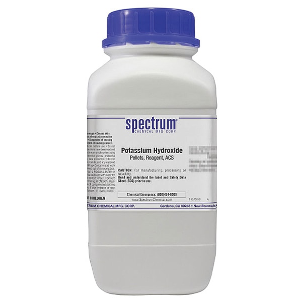 Potassium Hydroxide, Concentration Not Applicable, CAS Number 1310-58-3, Molecular Weight 56.11, Chemical Formula KOH, Chemical Container Material Plastic, Chemical Container Type Bottle, Chemical Grade ACS, Chemical Container Size 2.5 kg, Chemical Family Type Inorganic, Shelf Life 12 mo, Shipping Restrictions UN1813, Potassium Hydroxide, Solid, 8, PG II, Standards Not Applicable, Special Information Not Applicable
