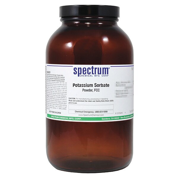 Potassium Sorbate, Powder, FCC, CAS Number 590-00-1, Molecular Weight 150.22, Chemical Formula C6H7KO2, Chemical Container Material Amber Glass, Chemical Container Type Bottle, Chemical Grade FCC, Chemical Container Size 500 g, Chemical Family Type Analytical Reagents, Shelf Life 24 mo, Shipping Restrictions Chemical Not Regulated For Transport