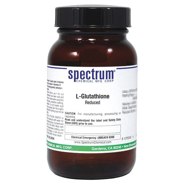 L-Glutathione Reduced Form, CAS Number 70-18-8, Molecular Weight F.W. 307.33, Chemical Formula C10H17N3O6S, Chemical Container Material Amber Glass, Chemical Container Type Bottle, Chemical Grade Lab, Chemical Container Size 25 g, Shelf Life 24 mo