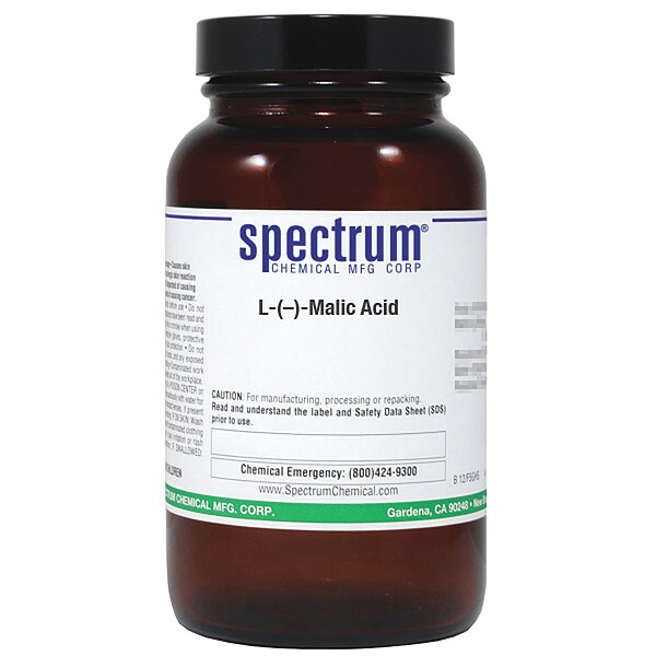 L-(-)-Malic Acid, Concentration 100 Percent, CAS Number 97-67-6, Molecular Weight 134.09, Chemical Formula C4H6O5, Chemical Container Material Amber Glass, Chemical Container Type Bottle, Chemical Grade Reagent, Chemical Container Size 100 g, Chemical Family Type Acids, Shelf Life 24 mo
