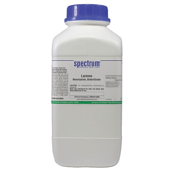 Lactose, Monohydrate, Biotech Grade, CAS Number 64044-51-5, Molecular Weight 360.31, Chemical Formula C12H22O11 x H2O, Chemical Container Material Plastic, Chemical Container Type Drum, Chemical Grade Purified, Chemical Container Size 2.5 kg, Chemical Family Type Analytical Reagents, Shelf Life 24 mo, Shipping Restrictions Chemical Not Regulated For Transport