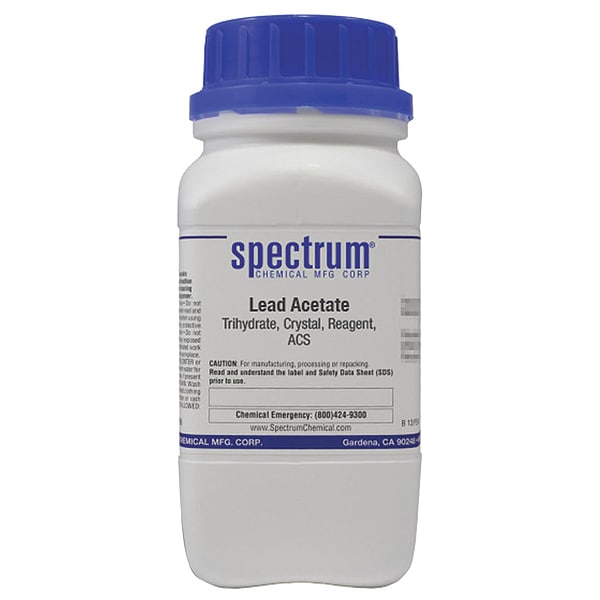 Lead Acetate, Trihydrate, Crystal, Reagent, ACS, CAS Number 6080-56-4, Molecular Weight 379.34, Chemical Formula C4H6O4Pb x 3H2O, Chemical Container Material Plastic, Chemical Container Type Bottle, Chemical Grade ACS, Chemical Container Size 500 g, Chemical Family Type Analytical Reagents, Shelf Life 24 mo, Shipping Restrictions UN1616, Lead Acetate, 6.1, PG III, Marine Pollutant, Special Information Possible Carcinogen
