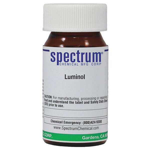 Luminol, CAS Number 521-31-3, Molecular Weight 177.16, Chemical Formula C8H7N3O2, Chemical Container Material Amber Glass, Chemical Container Type Bottle, Chemical Grade Reagent, Chemical Container Size 5 g, Chemical Family Type Analytical Reagents, Shelf Life 24 mo