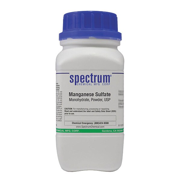 Manganese Sulfate - Monohydrate, Concentration Not Applicable, CAS Number 10034-96-5, Molecular Weight 138.38, Chemical Formula MnSO4�H2O, Chemical Container Material Plastic, Chemical Container Type Bottle, Chemical Grade USP, Chemical Container Size 500 g, Chemical Family Type Reagent, Shelf Life 36 mo, Shipping Restrictions Chemical Not Regulated For Transport, Standards Not Applicable, Special Information Not Applicable