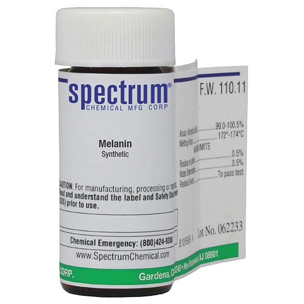 Melanin, Concentration 100 Percent, CAS Number 8049-97-6, Chemical Container Material Amber Glass, Chemical Container Type Bottle, Chemical Grade Reagent, Chemical Container Size 1 g, Chemical Family Type Acids, Shelf Life 24 mo, Special Information Pigment Responsible for The Color of Animal Skin, Hair, Feathers and Fur, Prepared By Oxidation of Tyrosine with Hydrogen Peroxide