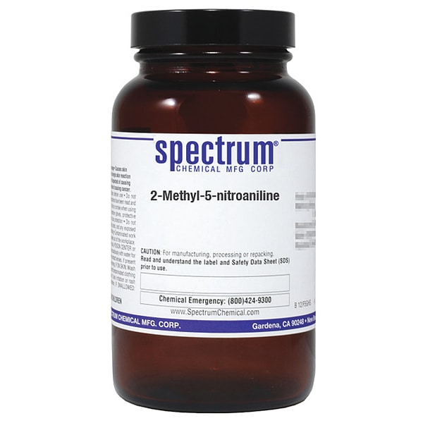 2-Methyl-5-Nitroaniline, Concentration 100 Percent, CAS Number 99-55-8, Molecular Weight 152.15, Chemical Formula C7H8N2O2, Chemical Container Material Amber Glass, Chemical Container Type Bottle, Chemical Grade Reagent, Chemical Container Size 100 g, Chemical Family Type Acids, Shelf Life 24 mo, Shipping Restrictions UN2660, Nitrotoluidines (Mono), 6.1, PG III