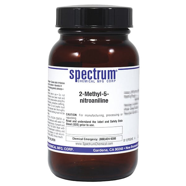 2-Methyl-5-Nitroaniline, Concentration 100 Percent, CAS Number 99-55-8, Molecular Weight 152.15, Chemical Formula C7H8N2O2, Chemical Container Material Amber Glass, Chemical Container Type Bottle, Chemical Grade Reagent, Chemical Container Size 25 g, Chemical Family Type Acids, Shelf Life 24 mo, Shipping Restrictions UN2660, Nitrotoluidines (Mono), 6.1, PG III