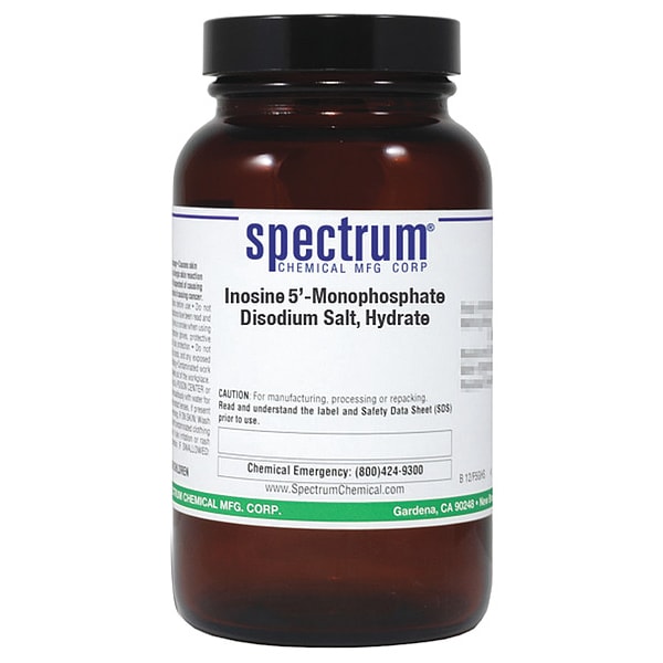 Inosine 5'-Monophosphate Disodium Salt, Hydrate, Concentration 100 Percent, CAS Number 4691-65-0, Molecular Weight 392.17, Chemical Formula C10H11N4O8PNa2.xH2O, Chemical Container Material Amber Glass, Chemical Container Type Bottle, Chemical Grade Reagent, Chemical Container Size 100 g, Chemical Family Type Bases, Shelf Life 24 mo