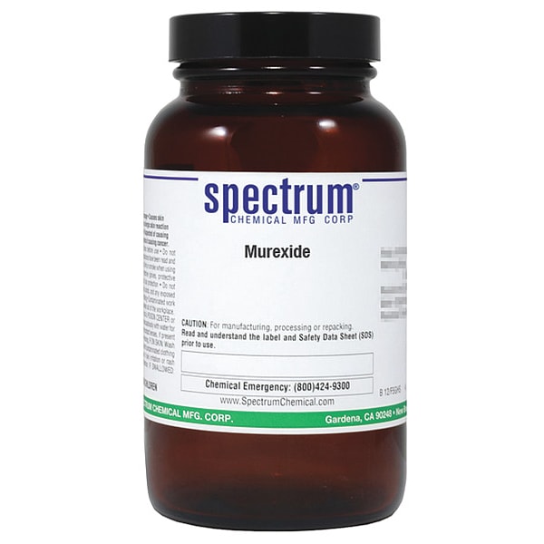 Murexide Indicator, Concentration Not Applicable, CAS Number 3051-09-0, Molecular Weight 284.19, Chemical Formula C8H8N6O6, Chemical Container Material Amber Glass, Chemical Container Type Bottle, Chemical Grade Lab, Chemical Container Size 100 g, Chemical Family Type Reagent, Shelf Life 24 mo, Shipping Restrictions Chemical Not Regulated For Transport, Standards Not Applicable, Special Information Not Applicable