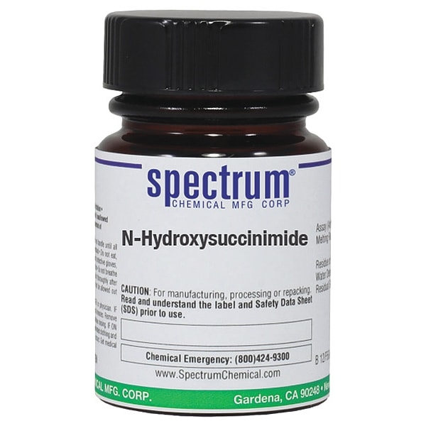 N-Hydroxysuccinimide, Concentration 100 Percent, CAS Number 6066-82-6, Molecular Weight 115.09, Chemical Formula C4H5NO3, Chemical Container Material Amber Glass, Chemical Container Type Bottle, Chemical Grade Reagent, Chemical Container Size 25 g, Shelf Life 24 mo