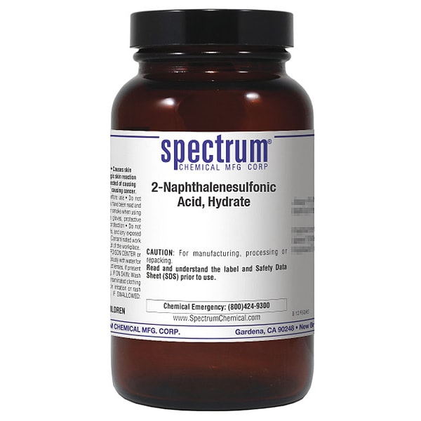 2-Naphthalenesulfonic Acid, Hydrate, Concentration 100 Percent, CAS Number 76530-12-6, Molecular Weight 208.24 (Anhyd.), Chemical Formula C10H8O3S.xH2O, Chemical Container Material Amber Glass, Chemical Container Type Bottle, Chemical Grade Reagent, Chemical Container Size 100 g, Chemical Family Type Acids, Shelf Life 24 mo, Shipping Restrictions UN2583, Alkyl Sulfonic Acids, Solid, 8, PG II