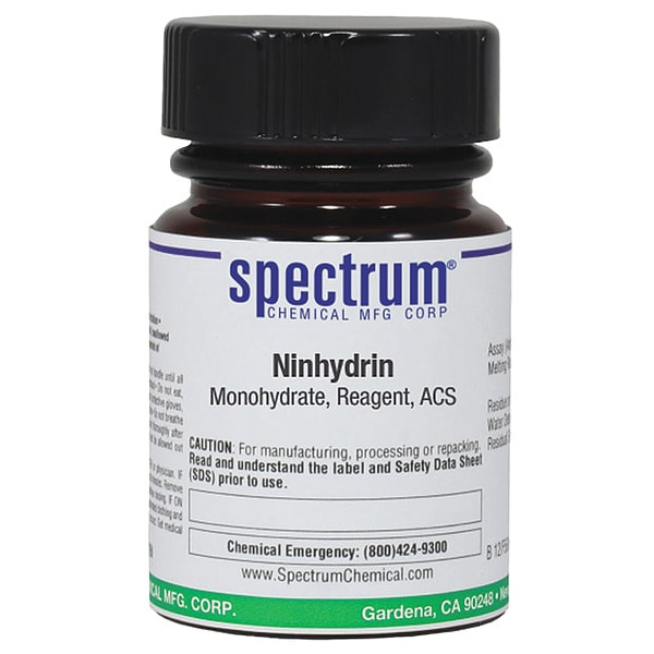 Ninhydrin, Monohydrate, Reagent, ACS, CAS Number 485-47-2, Molecular Weight 178.14, Chemical Formula C9H4O3 x H2O, Chemical Container Material Amber Glass, Chemical Container Type Bottle, Chemical Grade ACS, Chemical Container Size 25 g, Chemical Family Type Analytical Reagents, Shelf Life 24 mo, Shipping Restrictions Chemical Not Regulated For Transport