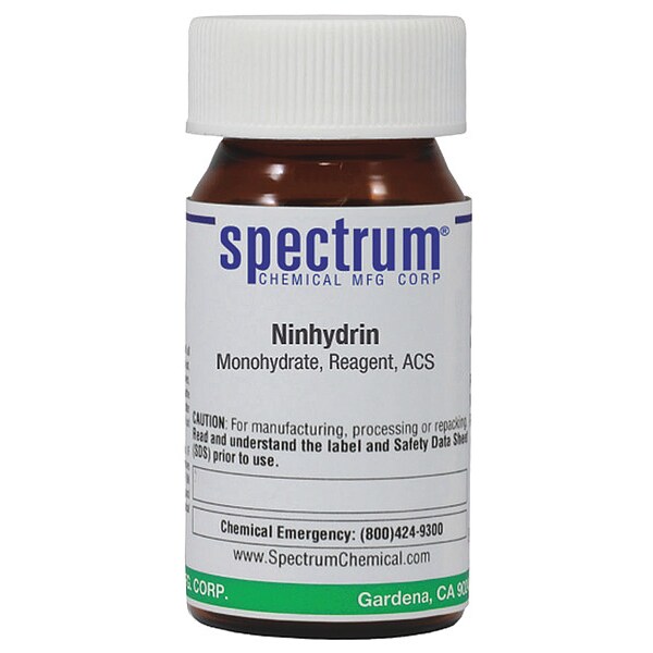 Ninhydrin - Monohydrate, Concentration Not Applicable, CAS Number 485-47-2, Molecular Weight 178.14, Chemical Formula C9H4O3�H2O, Chemical Container Material Amber Glass, Chemical Container Type Bottle, Chemical Grade ACS, Chemical Container Size 5 g, Chemical Family Type Reagent, Shelf Life 24 mo, Shipping Restrictions Chemical Not Regulated For Transport, Standards Not Applicable, Special Information Not Applicable