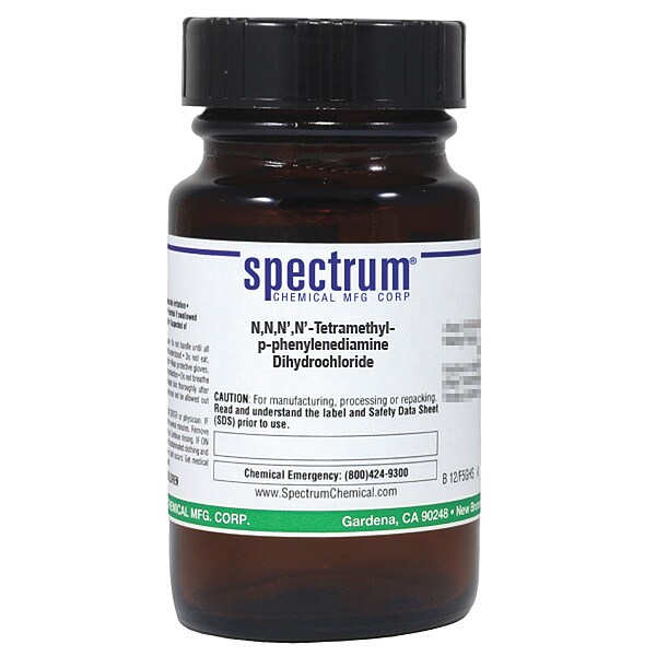 N,N,N',N'-Tetramethyl-P-Phenylenediamine Dihydrochloride, Concentration 100 Percent, CAS Number 637-01-4, Molecular Weight 237.17, Chemical Formula C10H16N2.2HCl, Chemical Container Material Amber Glass, Chemical Container Type Bottle, Chemical Grade Reagent, Chemical Container Size 25 g, Chemical Family Type Acids, Shelf Life 24 mo