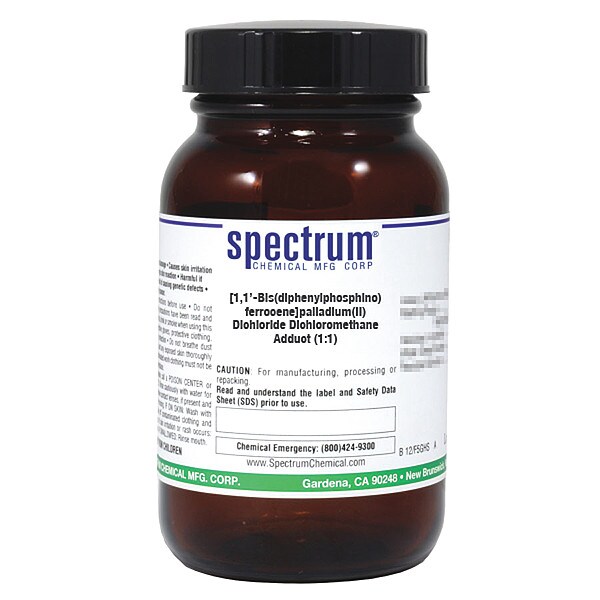 [1,1'-Bis(Diphenylphosphino)Ferrocene]Palladium(II) Dichloride Dichloromethane Adduct (1:1), Concentration 100 Percent, CAS Number 95464-05-4, Molecular Weight 816.64, Chemical Formula C34H28Cl2FeP2Pd.CH2Cl2, Chemical Container Material Amber Glass, Chemical Container Type Bottle, Chemical Grade Reagent, Chemical Container Size 25 g, Chemical Family Type Acids, Shelf Life 24 mo
