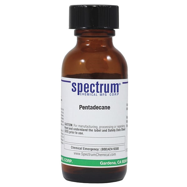 Pentadecane, Concentration 100 Percent, CAS Number 629-62-9, Molecular Weight 212.42, Chemical Formula C15H32, Chemical Container Material Amber Glass, Chemical Container Type Bottle, Chemical Grade Reagent, Chemical Container Size 25 mL, Chemical Family Type Acids, Shelf Life 24 mo