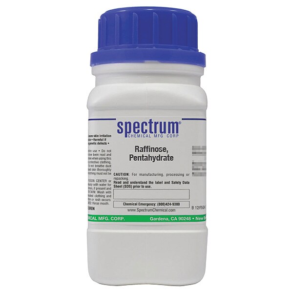 Raffinose, Pentahydrate, Concentration 100 Percent, CAS Number 17629-30-0, Molecular Weight 594.53, Chemical Formula C18H32O16.5H2O, Chemical Container Material Plastic, Chemical Container Type Bottle, Chemical Grade Reagent, Chemical Container Size 100 g, Chemical Family Type Acids, Shelf Life 24 mo
