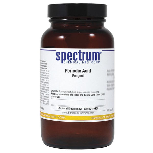 Periodic Acid, CAS Number 10450-60-9, Molecular Weight 227.96, Chemical Formula H5IO6, Chemical Container Material Amber Glass, Chemical Container Type Bottle, Chemical Grade Reagent, Chemical Container Size 500 g, Chemical Family Type Acids, Shelf Life 24 mo, Shipping Restrictions UN3085, Oxidizing solid, corrosive, n.o.s. (periodic acid), 5.1 (8), PG III