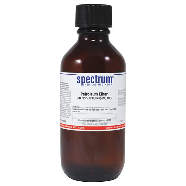 Petroleum Ether, Concentration B.R. 35 to 60 Degrees C, CAS Number 8032-32-4, Chemical Formula C6H14, Chemical Container Material Amber Glass, Chemical Container Type Bottle, Chemical Grade ACS, Chemical Container Size 500 mL, Chemical Family Type Solvent, Shelf Life 24 mo, Shipping Restrictions UN1268, Petroleum Distillate, n.o.s. (Ligroin), 3, PG II, Standards Not Applicable, Special Information Not Applicable