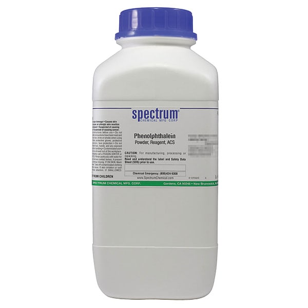 Phenolphthalein, Concentration Not Applicable, CAS Number 77-09-8, Molecular Weight 318.33, Chemical Formula C20H14O4, Chemical Container Material Plastic, Chemical Container Type Drum, Chemical Grade ACS, Chemical Container Size 2.5 kg, Chemical Family Type Reagent, Shelf Life 24 mo, Shipping Restrictions Chemical Not Regulated For Transport, Standards Not Applicable, Special Information Not Applicable