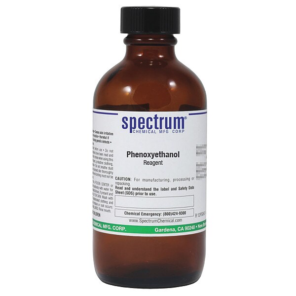 Phenoxyethanol, Reagent, CAS Number 122-99-6, Molecular Weight F.W. 138.16, Chemical Formula C8H10O2, Chemical Container Material Amber Glass, Chemical Container Type Bottle, Chemical Grade Reagent, Chemical Container Size 120 mL, Chemical Family Type Analytical Reagents, Shelf Life 24 mo, Special Information Formaldehyde Substitute.