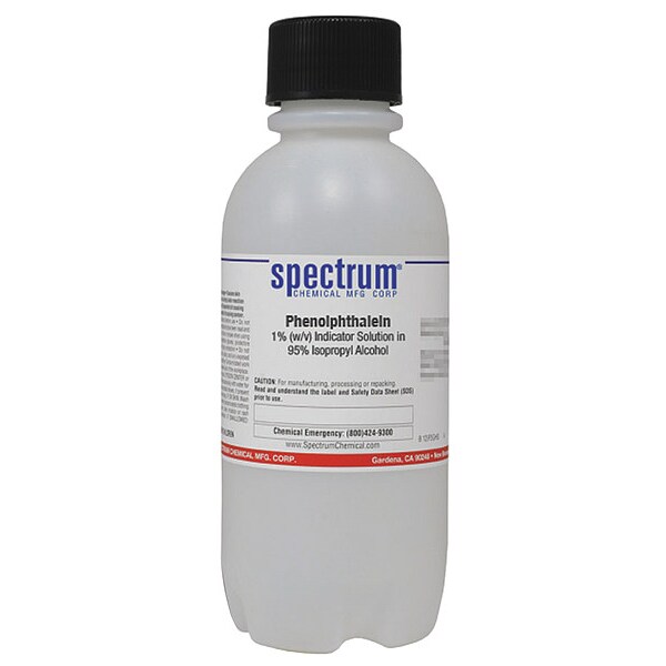 Phenolphthalein Indicator - in 95 Percent Isopropyl Alcohol, Concentration 1 Percent w/v, CAS Number 67-63-0, 77-09-8, 7732-18-5, Molecular Weight 60.11 F.W; 18.02 F.W; 318.33 F.W, Chemical Formula C3H8O; H2O; C20H14O4, Chemical Container Material Plastic, Chemical Container Type Bottle, Chemical Grade Lab, Chemical Container Size 500 mL, Chemical Family Type Solution, Shelf Life 24 mo, Shipping Restrictions UN1219, Isopropanol, Solution, 3, PG II, Standards Not Applicable