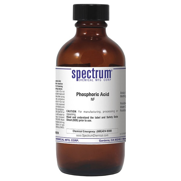 Phosphoric Acid, Concentration Not Applicable, CAS Number 7664-38-2, Molecular Weight 98, Chemical Formula H3PO4, Chemical Container Material Amber Glass, Chemical Container Type Bottle, Chemical Grade NF, Chemical Container Size 100 mL, Chemical Family Type Acid, Shelf Life 24 mo, Shipping Restrictions UN1805, Phosphoric Acid Solution, 8, PG III, Standards Not Applicable, Special Information Not Applicable
