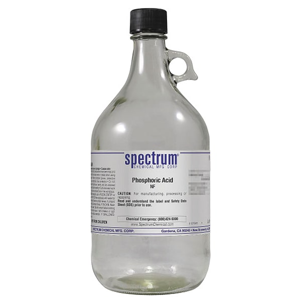 Phosphoric Acid, Concentration Not Applicable, CAS Number 7664-38-2, Molecular Weight 98, Chemical Formula H3PO4, Chemical Container Material Clear Glass, Chemical Container Type Bottle, Chemical Grade NF, Chemical Container Size 2.5 L, Chemical Family Type Acid, Shelf Life 24 mo, Shipping Restrictions UN1805, Phosphoric Acid Solution, 8, PG III, Standards Not Applicable, Special Information Not Applicable