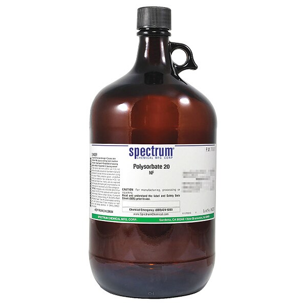 Polysorbate 20, Concentration Not Applicable, CAS Number 9005-64-5, Molecular Weight 1227.72, Chemical Formula C58H114O26, Chemical Container Material Amber Glass, Chemical Container Type Bottle, Chemical Grade NF, Chemical Container Size 4 L, Chemical Family Type Reagent, Shelf Life 24 mo, Shipping Restrictions Chemical Not Regulated For Transport, Standards Not Applicable, Special Information Not Applicable