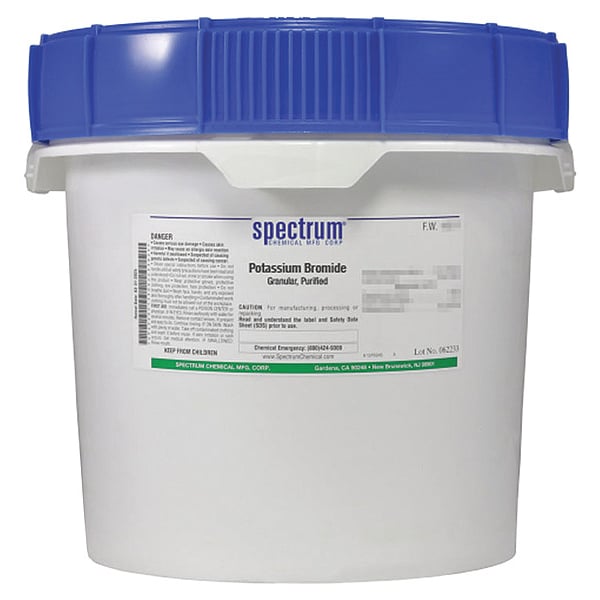 Potassium Bromide, Concentration Not Applicable, CAS Number 7758-02-3, Molecular Weight 119, Chemical Formula KBr, Chemical Container Material Plastic, Chemical Container Type Drum, Chemical Grade Lab, Chemical Container Size 12 kg, Chemical Family Type Inorganic, Salt, Shelf Life 24 mo, Shipping Restrictions Chemical Not Regulated For Transport, Standards Not Applicable, Special Information Not Applicable