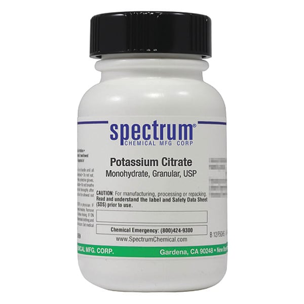 Potassium Citrate, Granular, USP, CAS Number 6100-05-6, Molecular Weight F.W. 324.41, Chemical Formula C6H5K3O7�H2O, Chemical Container Material Plastic, Chemical Container Type Bottle, Chemical Grade USP, Chemical Container Size 50 g, Chemical Family Type Analytical Reagents, Shelf Life 24 mo