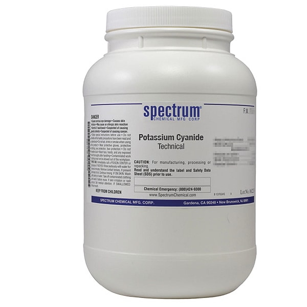 Potassium Cyanide, Technical, CAS Number 151-50-8, Molecular Weight F.W. 65.12, Chemical Formula KCN, Chemical Container Material Plastic, Chemical Container Type Bottle, Chemical Grade Technical, Chemical Container Size 2.5 kg, Chemical Family Type Analytical Reagents, Shelf Life 24 mo, Shipping Restrictions UN1680, Potassium cyanide, 6.1, PG I, marine pollutant