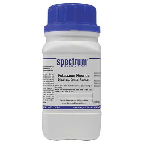Potassium Fluoride - Dihydrate, Concentration Not Applicable, CAS Number 13455-21-5, Molecular Weight 94.13, Chemical Formula KF�2H2O, Chemical Container Material Plastic, Chemical Container Type Bottle, Chemical Grade Lab, Chemical Container Size 125 g, Chemical Family Type Reagent, Shelf Life 24 mo, Shipping Restrictions UN1812, Potassium Fluoride, Solid, 6.1, PG III, Standards Not Applicable, Special Information Not Applicable