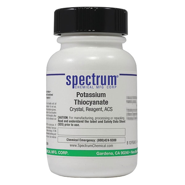 Potassium Thiocyanate, Concentration Not Applicable, CAS Number 333-20-0, Molecular Weight 97.18, Chemical Formula KSCN, Chemical Container Material Plastic, Chemical Container Type Bottle, Chemical Grade ACS, Chemical Container Size 25 g, Chemical Family Type Reagent, Shelf Life 24 mo, Shipping Restrictions Chemical Not Regulated For Transport, Standards Not Applicable, Special Information Not Applicable